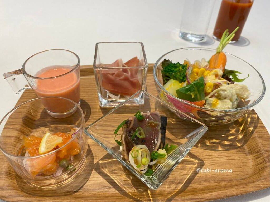 左上から、スムージー、生ハム、サラダ。左下はサーモン、そして鰹のたたきです。鰹のたたきが美味しくて、お代わりしてしまいました。