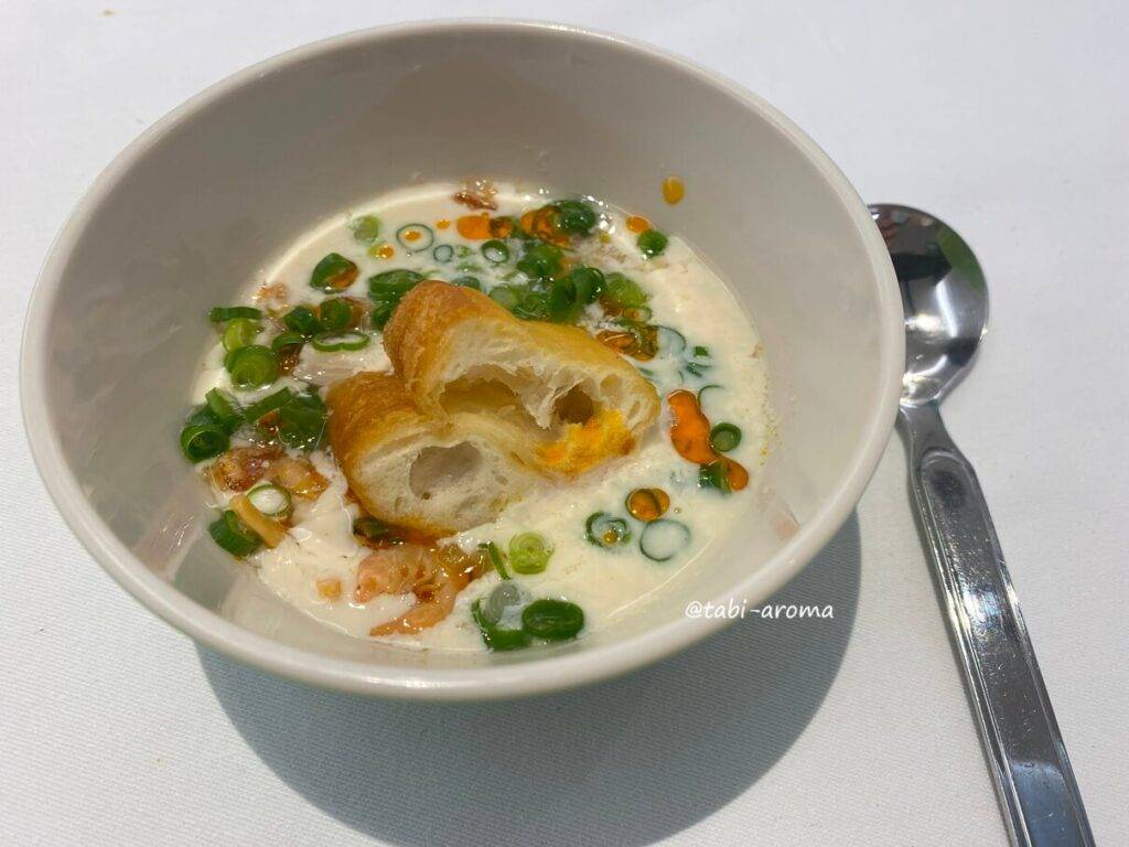 びっくりしたのは、台湾の定番朝ごはんの「鹹豆漿(シェントウジャン)」があったこと。シェントウジャンは、豆乳に酢を入れて、おぼろ豆腐状に固めたスープです。豆乳と酢、そして具材が用意されており、自分で加減をしながら作ることができました。