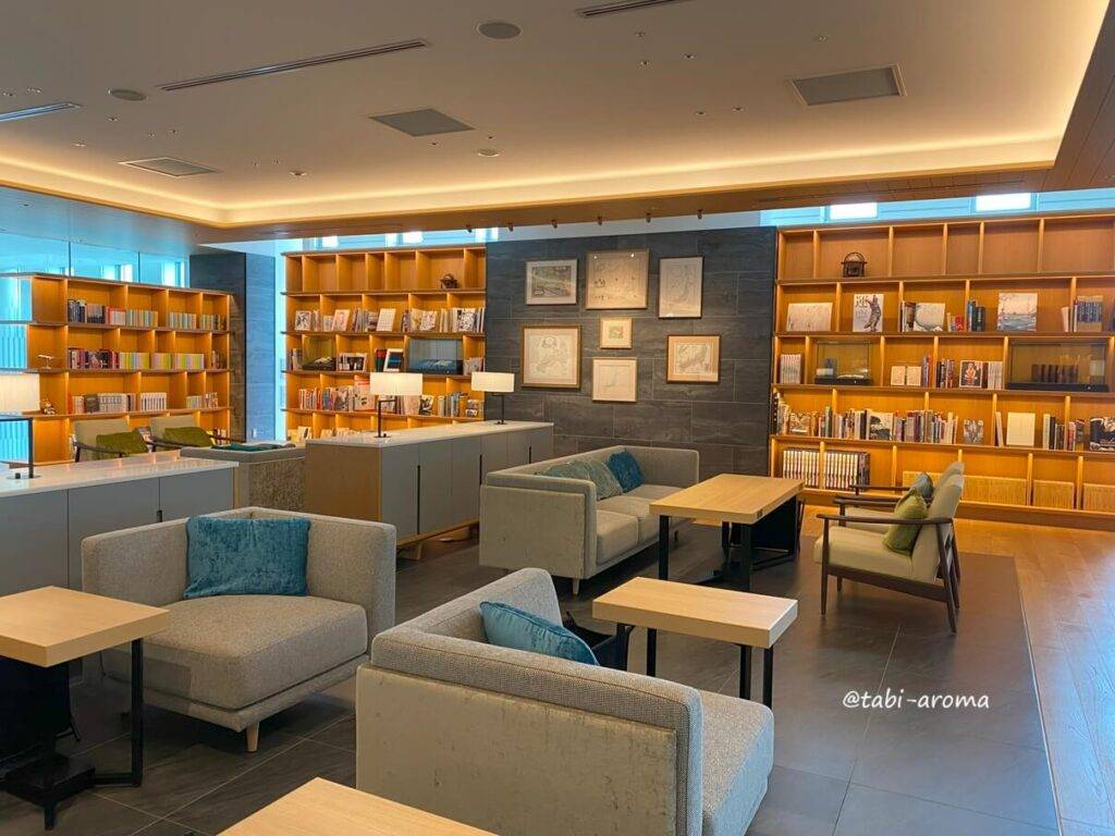 こちらのカフェでは、日本美術・文化、旅行などの関連書籍を楽しみながらゆったりと過ごせる全席ソファーの落ち着いた空間です。宿泊以外のお客様も利用できます。