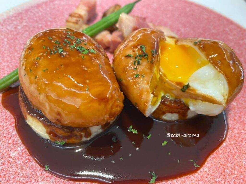 フランスのブルゴーニュ地方の名物料理 ポーチ・ド・エッグに赤ワインソースがかかっています。イングリッシュマフィンや旬の野菜と共に楽しめた一皿。