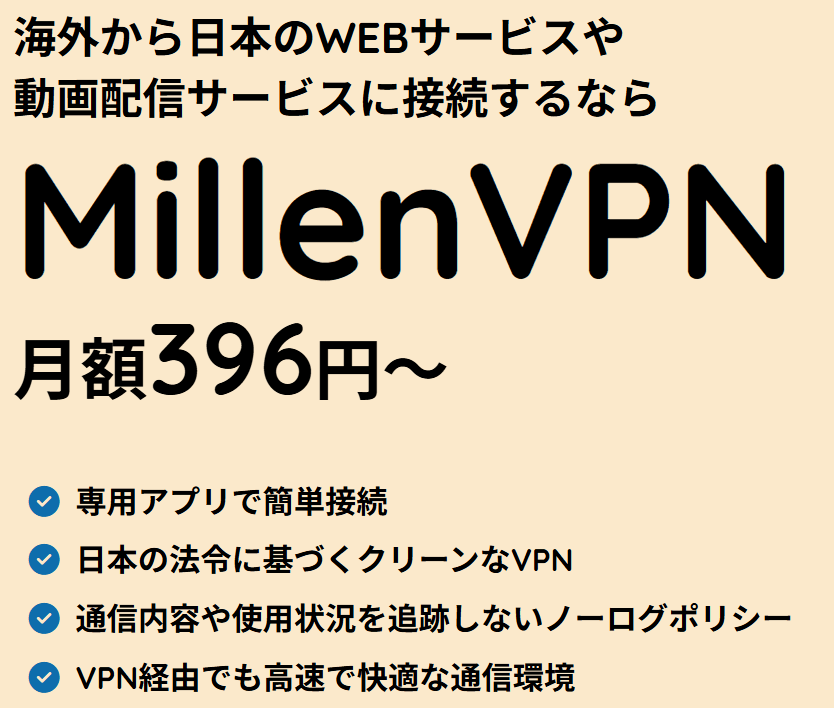 ところで、MillenVPNで日本のサーバーを経由すれば、インターネットへの接続が厳しい国(中国・ミャンマー等)に滞在していても、SNSやブラウザなどを普段通り使用できるそうです。