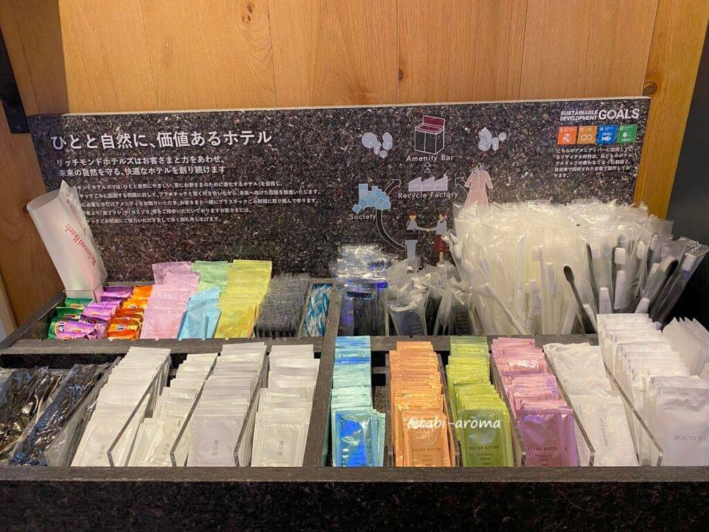 チェックインの時間になったのでスタッフの方に声をかけると、部屋まで案内してくれるということでした。その前に、エレベーターの前に置かれているアメニティもいただいて行きましょう。アメニティは、自由に持っていけます。歯ブラシだけでなく、化粧水やメイク落とし、入浴剤もあり、至れり尽くせりです。