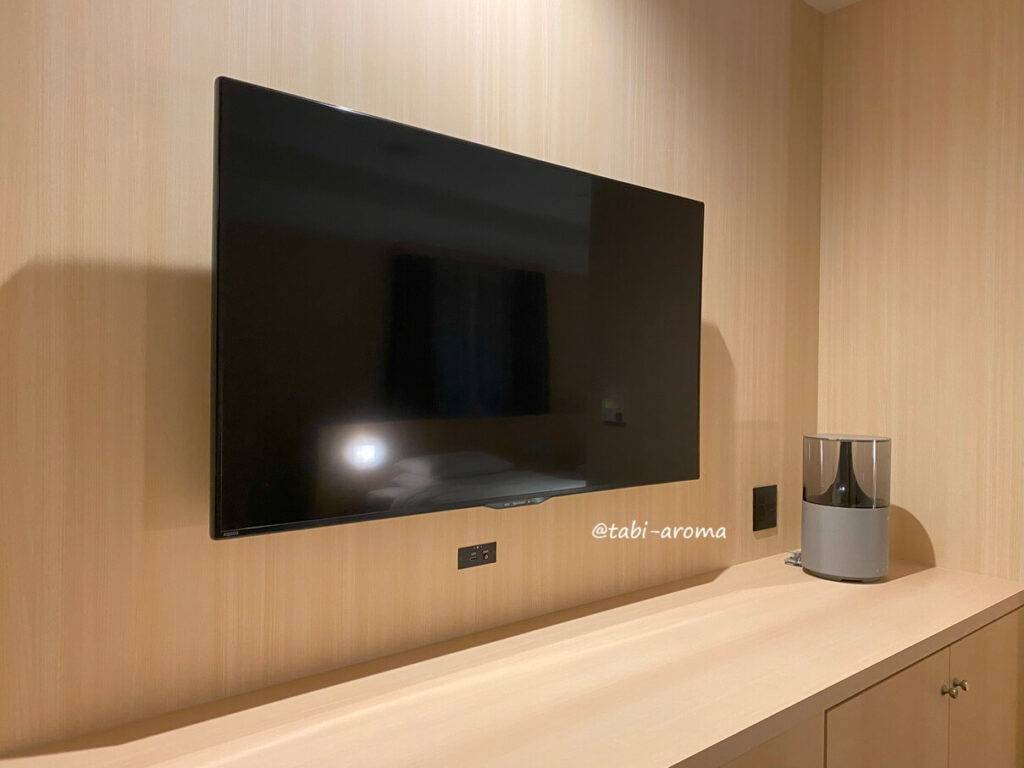 大型テレビにBOSEのスピーカー、テレビの下にはHDMI端子とオーディオ端子があり、パソコンやFire TV Stickなどを接続して視聴できます。