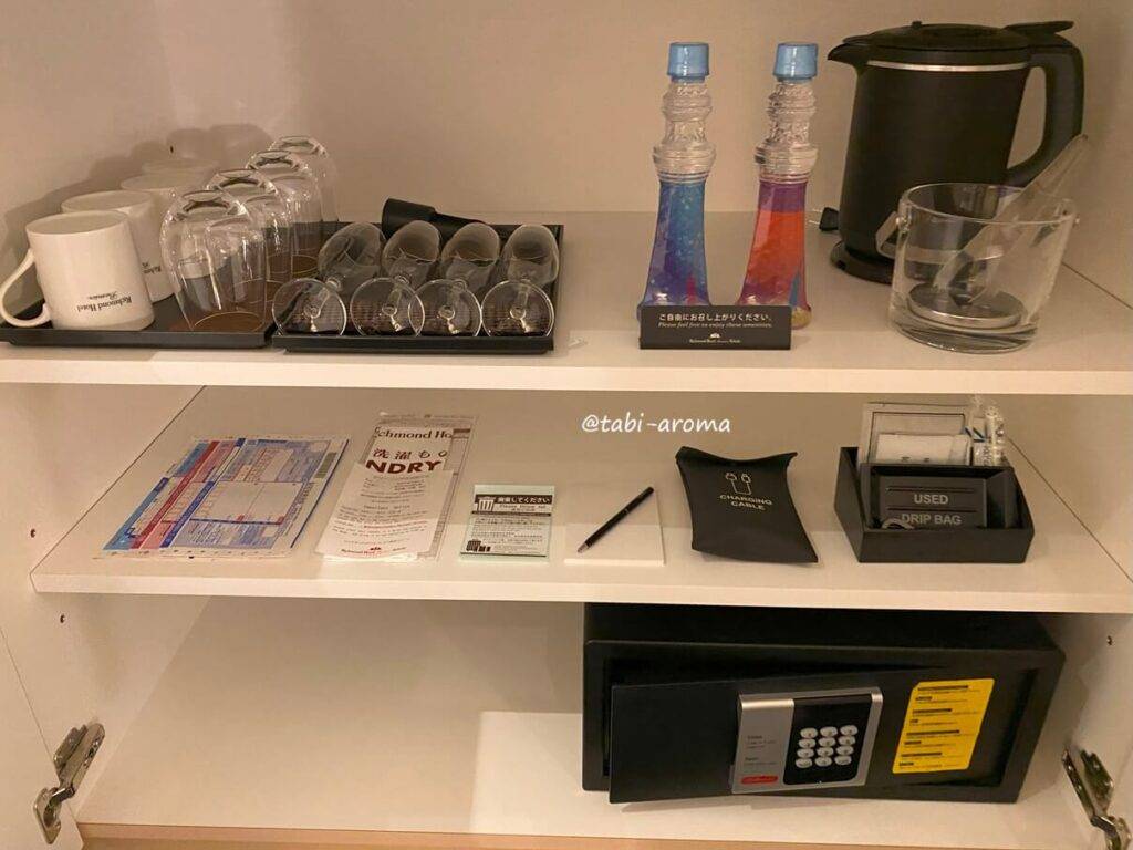 その下の棚には、カップ類や水、コード類が置かれています。