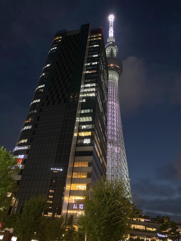 スカイツリーもライトアップされていて、昼間とは全く違った雰囲気になりました。しかし、なぜもう少し回ってライトアップされた写真を撮らなかったのか?お腹が空いていて急いでいたのでしょうね・笑。