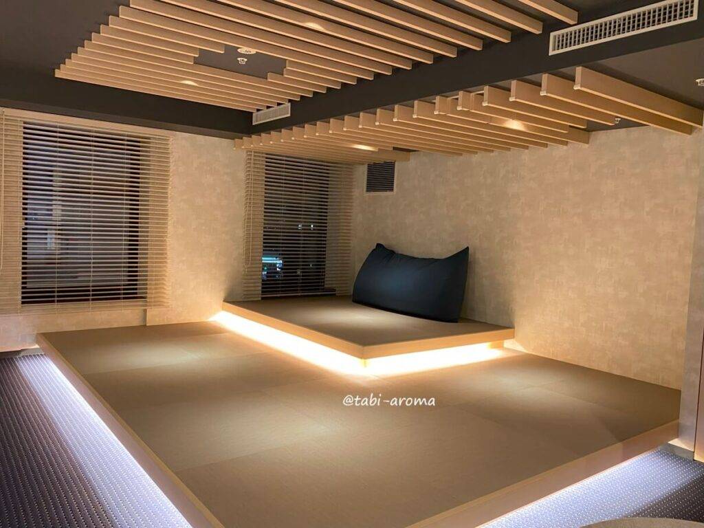 宿泊者が自由に使える空間。ビーズソファーの Yogibo(ヨギボー)も置いてありました。ここから隅田川の花火も見えるのでしょうか。もし見えるとしたら、最高の場所ですね。