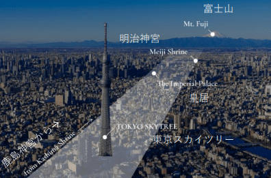 ところで、東京スカイツリーは、富士山や明治神宮、皇居(昔の江戸城)、鹿島神宮(茨城県鹿嶋市)など、古代遺跡や聖地が一直線に並ぶ「レイライン」の上に建っているそうです。そのため、ポジティブなエネルギーが集まる場所と言われています。