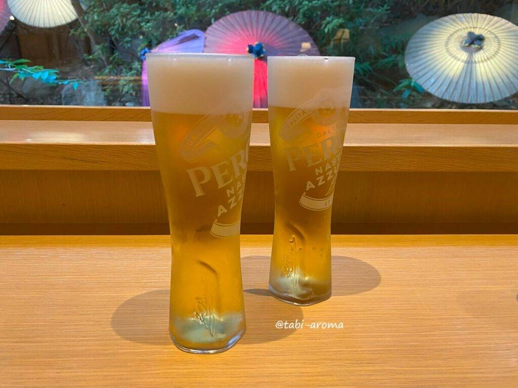 まずは、イタリアのPERONI(ペローニ)ビールでのどを潤します。時々テレビのCMで見ていた気になったいたのですが、まさかこちらでいただけるとは思っていませんでした。柑橘系の香り、バランスの取れた苦み、喉ごしすっきり、美味しいビールでした^^