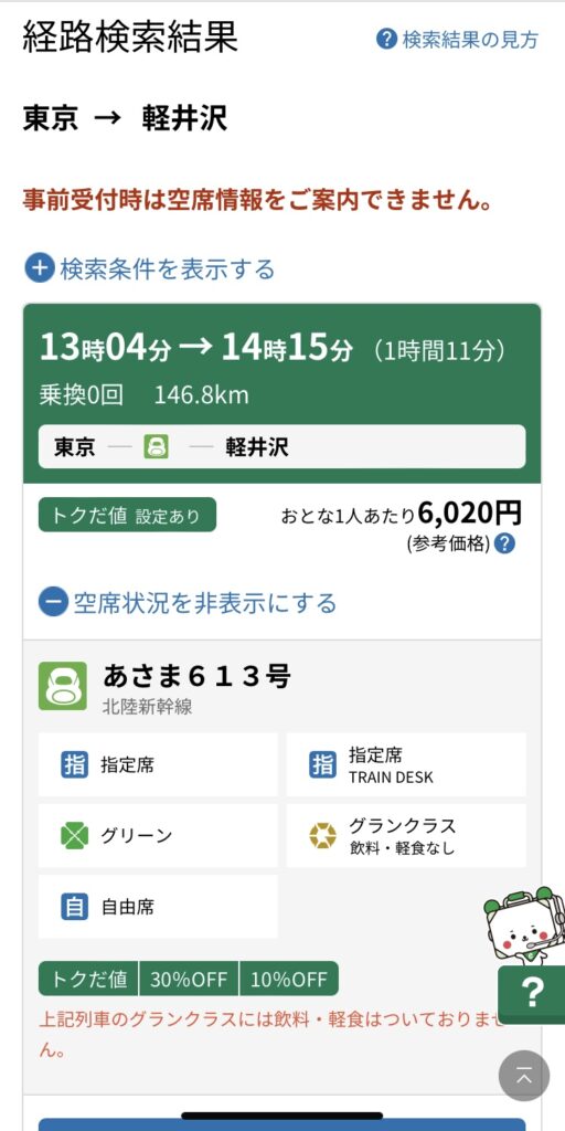 今回は、東京から軽井沢までのチケットを事前予約しました。