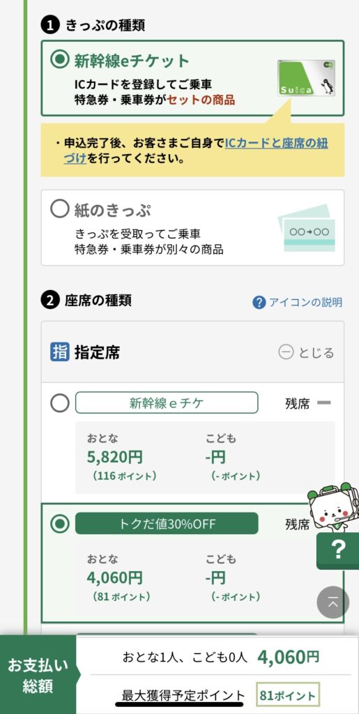 予約したい便を選んで「きっぷ・座席の種類選択へ進む」をタップすると、右の画面が表示されます。