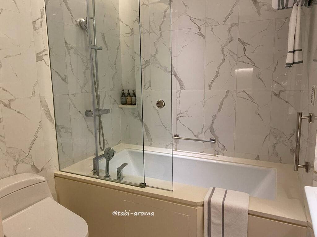 大きくて寛げるサイズですが、幅があるので入るのに苦労しました。手すりをつかめば大丈夫ですが。これがちょっと不便な点。また、湯量も少なく感じました。ここは、前回泊まった「ステイブリッジ・バンコク・スクンビット」の方がいいですね。あちらだと大浴場がありますし。