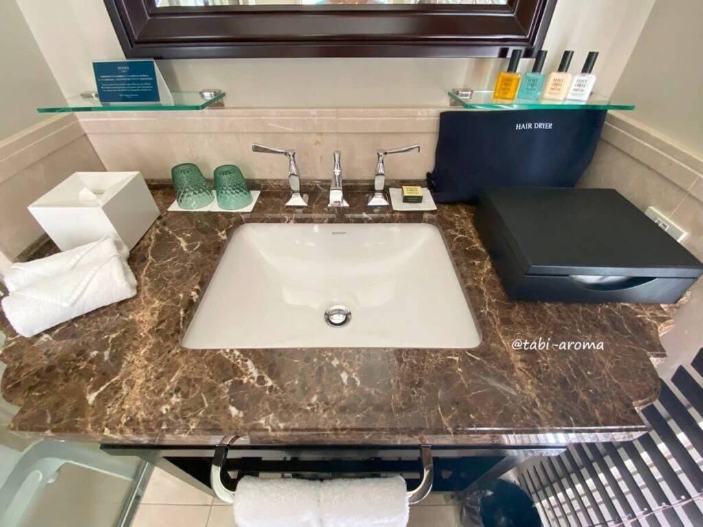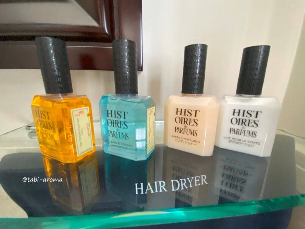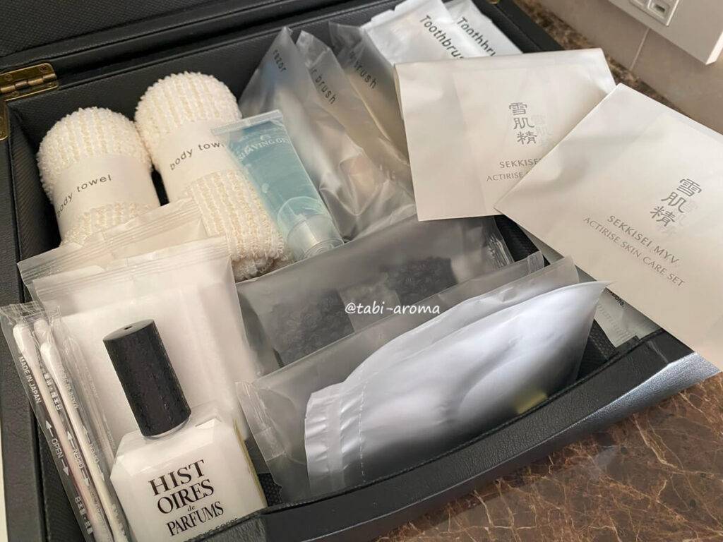 基礎化粧品は雪肌精ですが、シャンプーなどはホテルがイストワール ドゥ パルファンとコラボしたオリジナルだそうです。香りもよく使い心地もよかったです。なお、このアメニティは、スイートルーム以外の客室に設置されています。