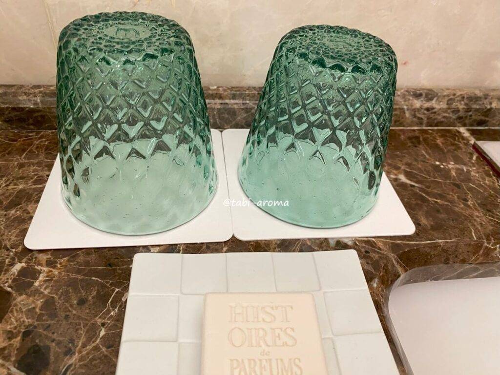 コップも可愛いですよね。こういった小物まで気遣っていると感じると、ホテルでの滞在が楽しくなります。ちなみに、固形石鹸もありました。
