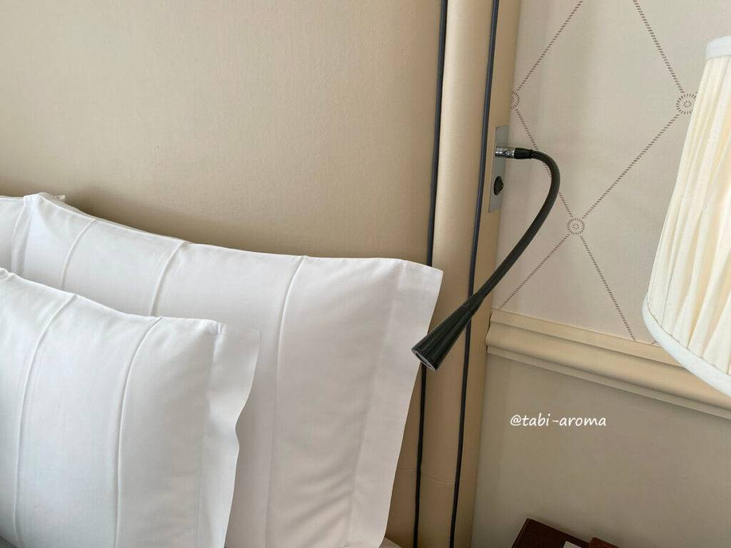 ただ、シモンズ社の厚みのあるマットレスに手触りのよいキルトトップ、枕の柔らかさが好みで、心地よい眠りを誘ってくれました。枕もとにはリーディングライトがあり、部屋にいると快適さしか感じませんでした。