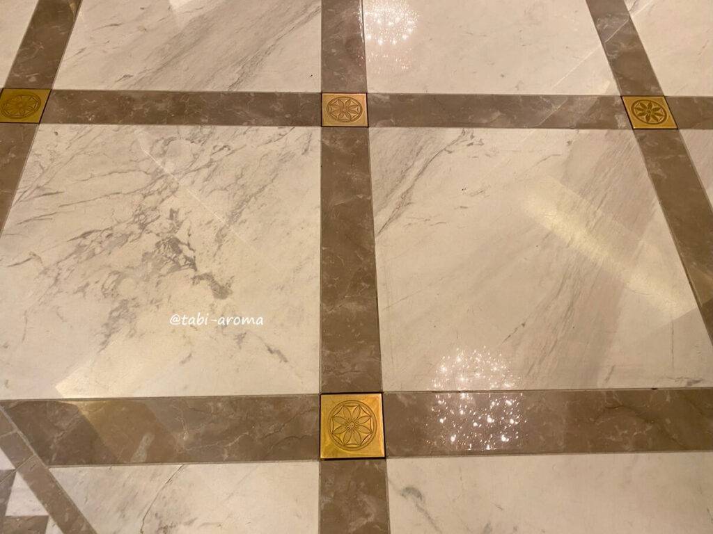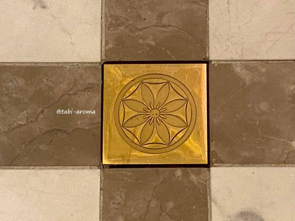 ロビーの床には、クレマチスの花をかたどった真鍮(しんちゅう)が埋め込まれています。復原されたドームのレリーフにもあしらわれているクレマチスの花言葉は「旅人の喜び」。