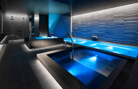 都会の洞窟をイメージした、ブルーのライトが幻想的なバスルームには、血行促進や代謝アップが期待できる人工炭酸泉と、人工温泉といった2つの大浴槽があります。サウナも2種類。ドライサウナと、じんわりと体を芯から温めるスチームサウナです。