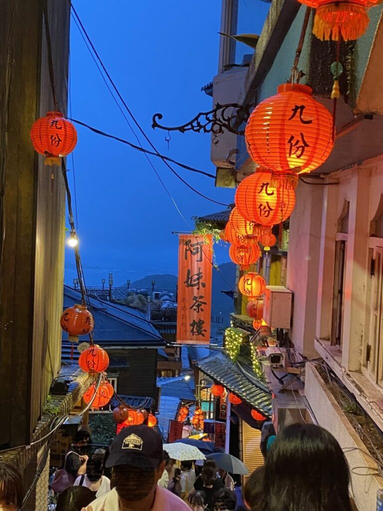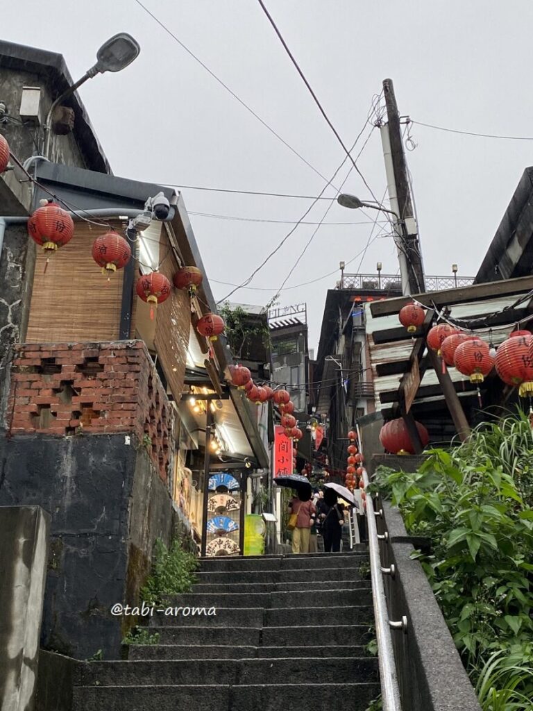 九份は急な階段も多く、また狭いので、傘をさして上り下りするのは、かなり大変です。