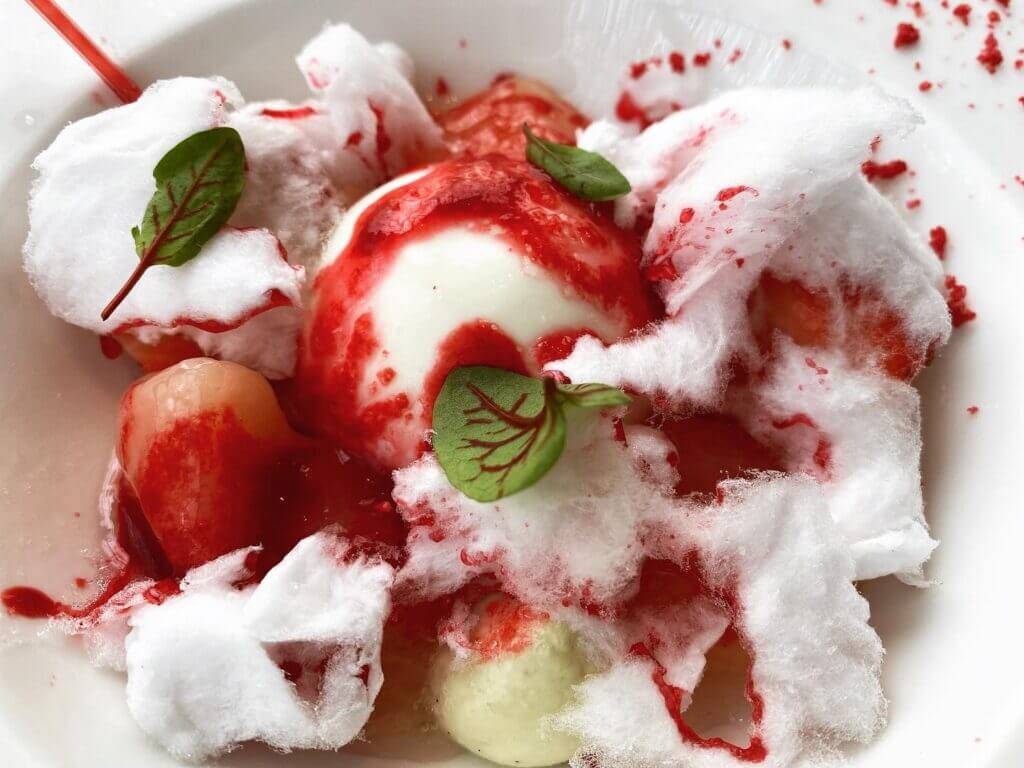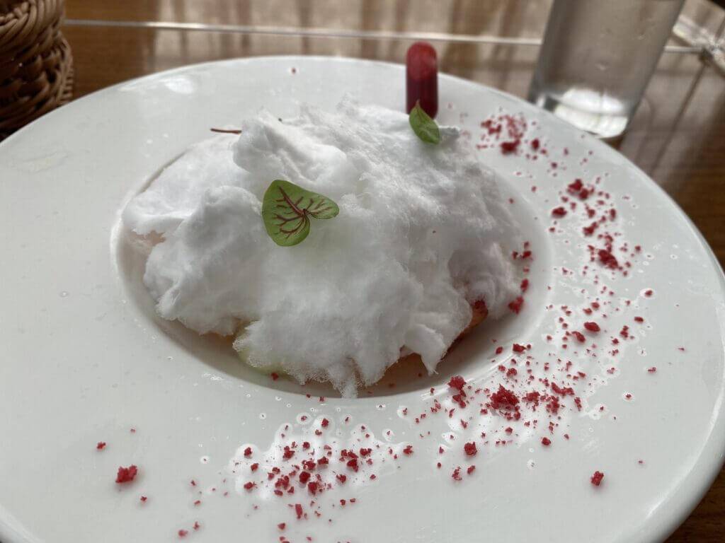 横に付いていた苺ソースをかけると、綿菓子がとけて、中からムースなどが出てきました。今までになかった(?)新しい趣向のデザートです。