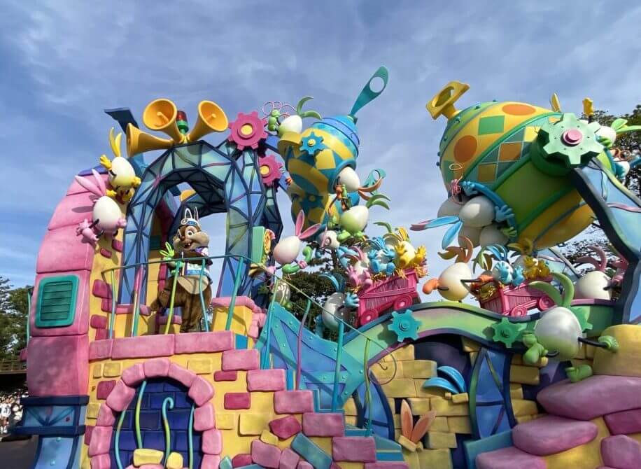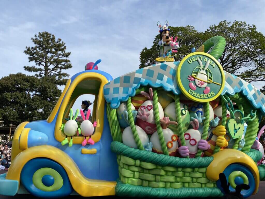 「うさたま大脱走!」は、ディズニーの仲間たちと、ウサギの耳がついたタマゴのキャラクター“うさたま”がドタバタ大騒動を繰り広げるヘンテコ楽しいパレードです。