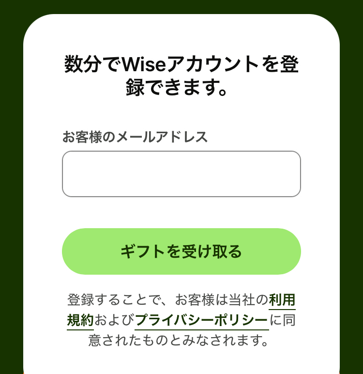 ご自身のメールアドレスを入力して、「ギフトを受け取る」をタップすると下の画面になります。