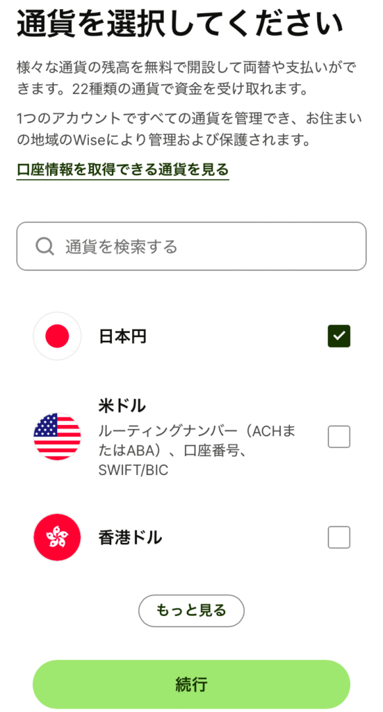 最初、通貨は「日本円」を選択しておけば大丈夫です。
