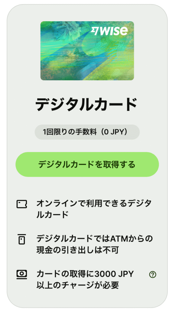 実際のカードの取得には3,000円のチャージ(入金)が必要ですが、この3,000円は、後日WISE内で外貨に両替して使えます。また、その3,000円は日本のイオン銀行のATMで引き出すこともできました。デポジットや手数料は発生しません。
