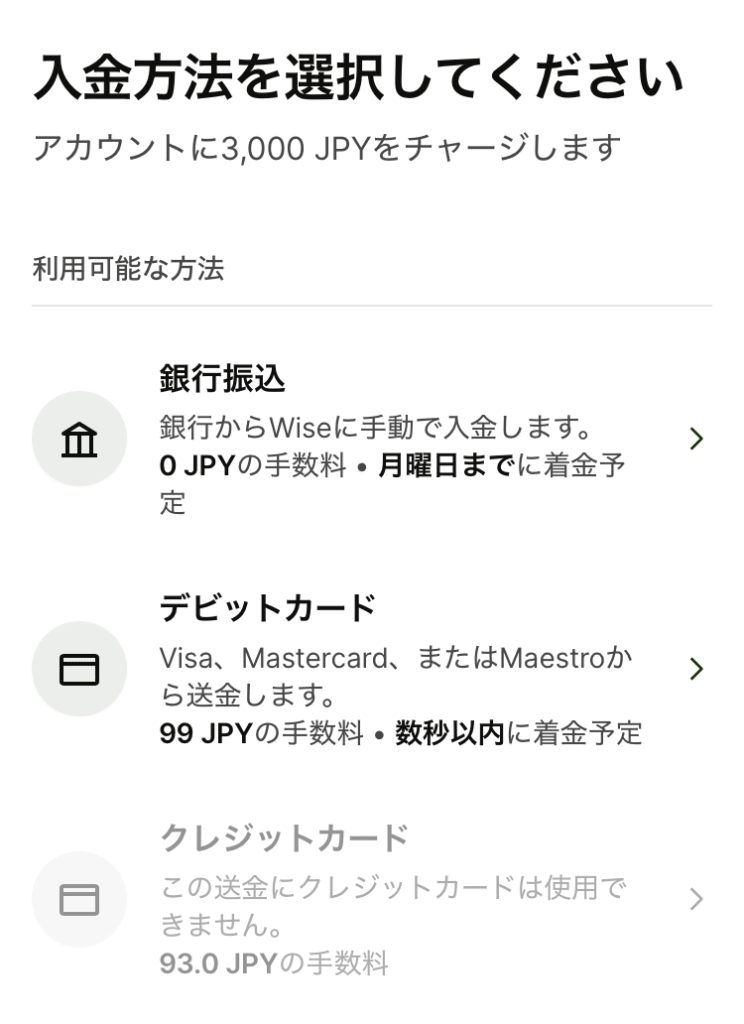 紹介リンクから進んだ場合、カード発行手数料(1,200円)が不要の代わり、3,000円をチャージします。初回のチャージは「銀行振込」だと手数料が一切かからないので、こちらを選びました。