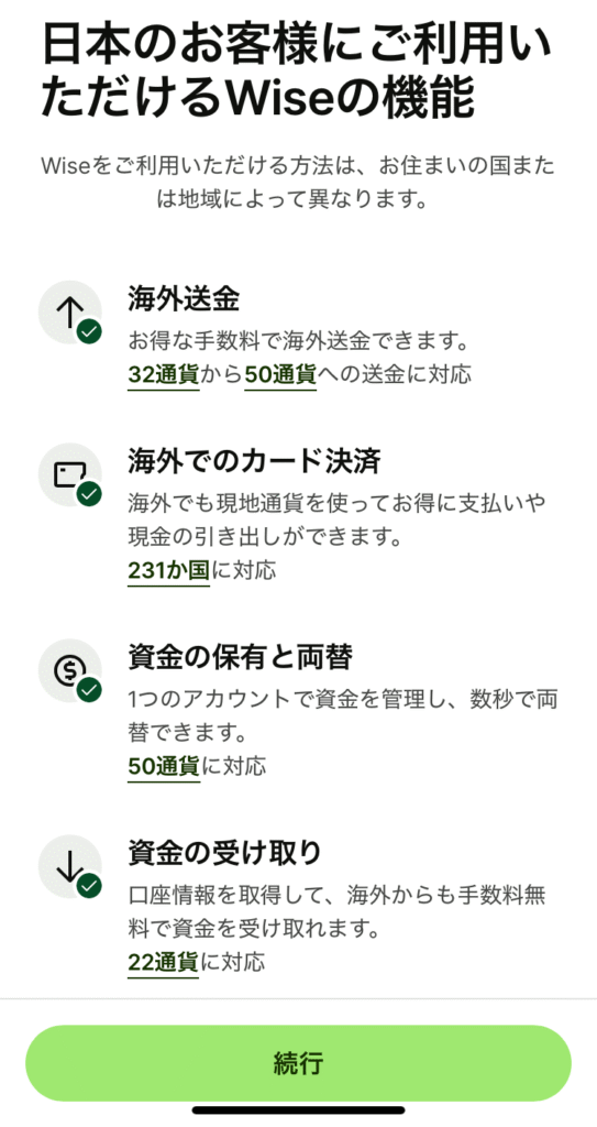 日本で利用できる機能が表示されますので、確認後「続行」をタップします。