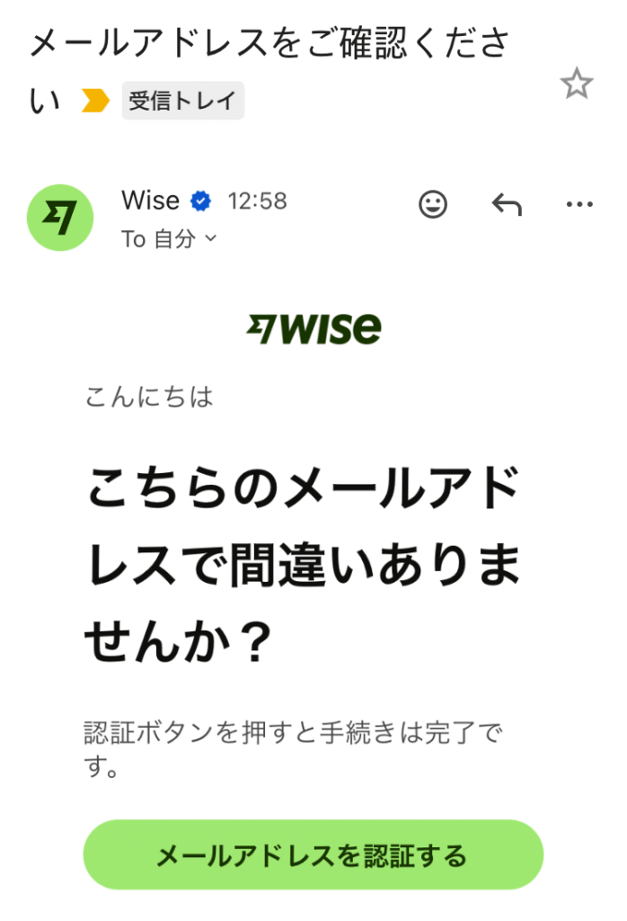 スマートフォンで本人確認の書類を送った後いくつか質問があり、年間送金額(推定)を回答したらWise側で書類の確認が入ります。書類確認完了のメールは30分ほどで送られてきました。